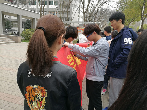 3月17日下午,在信息工程学院楼下举行“学雷锋、树新风、争当校园文明使者”的签名活动,各班新生代表积极地在横幅上签上自己的名字。学生会成员积极向师生宣传雷锋精神,号召更多的师生参与到学习雷锋精神中来,为学校、为社会奉献自己的一份力量。