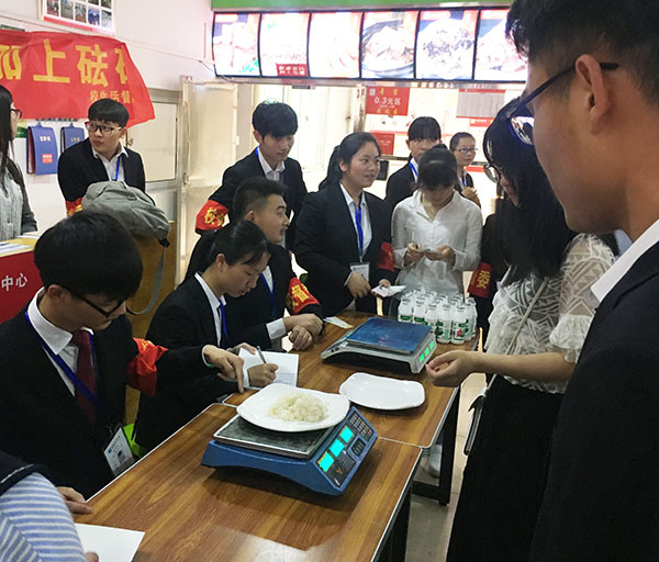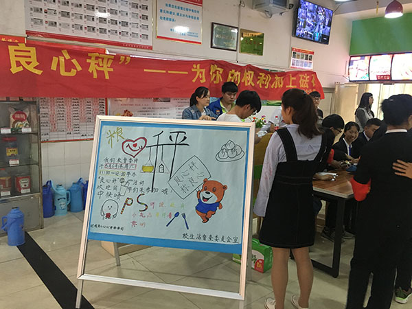 本网讯(通讯员:谭玲) 为提升师生日常就餐的维权意识,加强对食堂的监督管理,在总务处的安排指导下,5月6日中午,校生活督查委员会的同学们在bat365中快食堂开展了以“良心秤,为你的权利加上砝码”为主题的校园就餐维权公益活动。