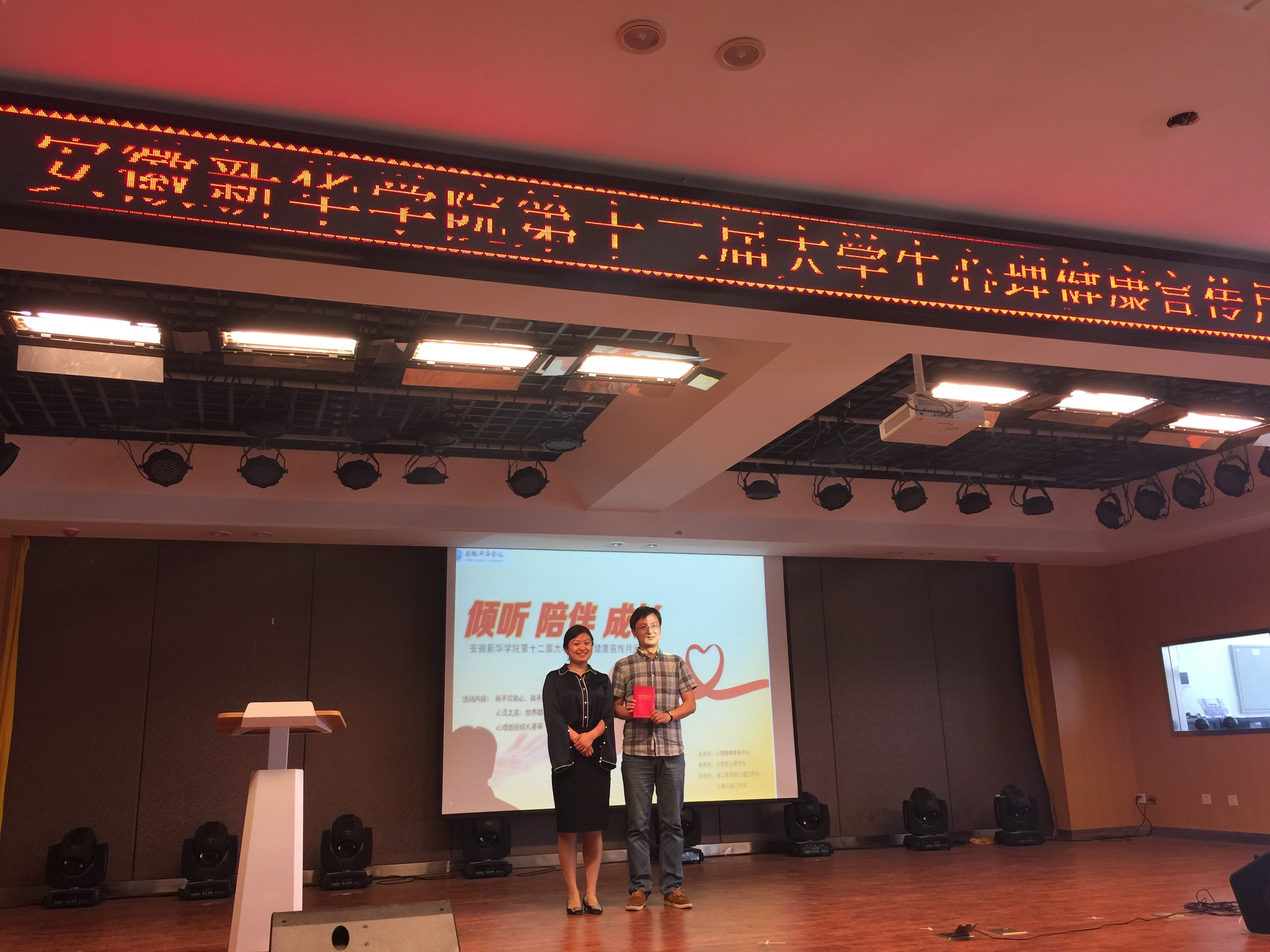 本网讯(通讯员:凌晨)5月25日中午,“倾听 陪伴 成长”bat365在线中国官网登录入口第十二届大学生心理健康宣传月闭幕式暨颁奖典礼在校小礼堂隆重举行。本次活动由学生处心理健康教育中心主办,大学生心理协会承办,各二级学院心理工作站及公寓心理工作站协办。学生处处长助理祝静静,学生处、团委老师代表,各二级学院分管心理工作的秘书、心理辅导员、心理联络员代表参加了本次闭幕式。