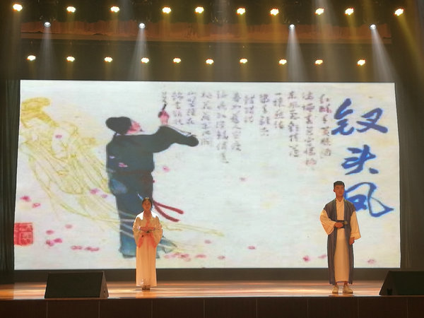 今年4月,文化与新闻传播学院按照大赛要求组织了校级古诗文朗诵比赛,从200多个作品中遴选出省赛作品《木兰辞》《钗头凤》《山雀子躁醒的江南》。文化与新闻传播学院专业教师积极指导学生选稿、录音、排练,并引导学生准确及时地、高质量地完成“理解稿件——具体感受——形之于声——及于受众”的过程。最终,《钗头凤》在全省90所高校选送的353件作品中脱颖而出,成功挺进决赛。在决赛的舞台上,两位同学以高超的朗诵技巧、真挚细腻的情感表达,赢得了评委的一致称赞。