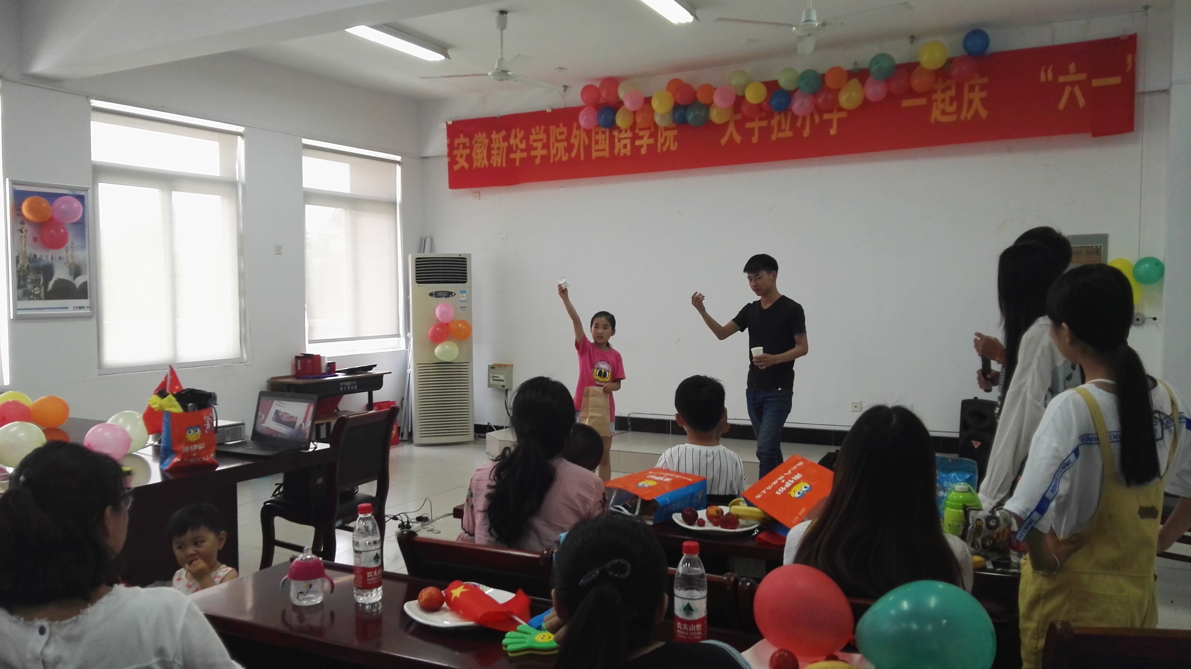 下午场活动为“大手牵小手,大家一起秀”。由外国语学院助理团和学生会精选的节目《大王叫我来巡山》《魔术》《小人物》受到了小朋友的喜爱。特殊的节日,小朋友们也是有备而来。钱娟老师的女儿吴君怡带来的是葫芦丝表演《打水姑娘》《小夜曲》,金怀梅老师的女儿汪紫芊演唱《三只小熊》,丁海燕老师的儿子朱宏瑞和他的朋友一起演唱《妈妈宝贝》,马兰老师的女儿陈宇萱朗诵《小佳佳的信》,崔芳老师的女儿吴婧萱表演舞蹈《shake it》。现场气氛热闹、文艺、和谐、融洽。大家一起度过了一个愉快而有意义的“六一”儿童节。