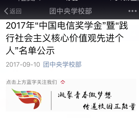 “电信奖学金”的设立和选拔对于于广大青年学生深入学习和践行社会主义核心价值观活动有着积极的促进作用,校团委积极通过此类奖项发掘了校优秀学生典型,引导着广大青年学生勤奋学习、砥砺品格、全面发展。
