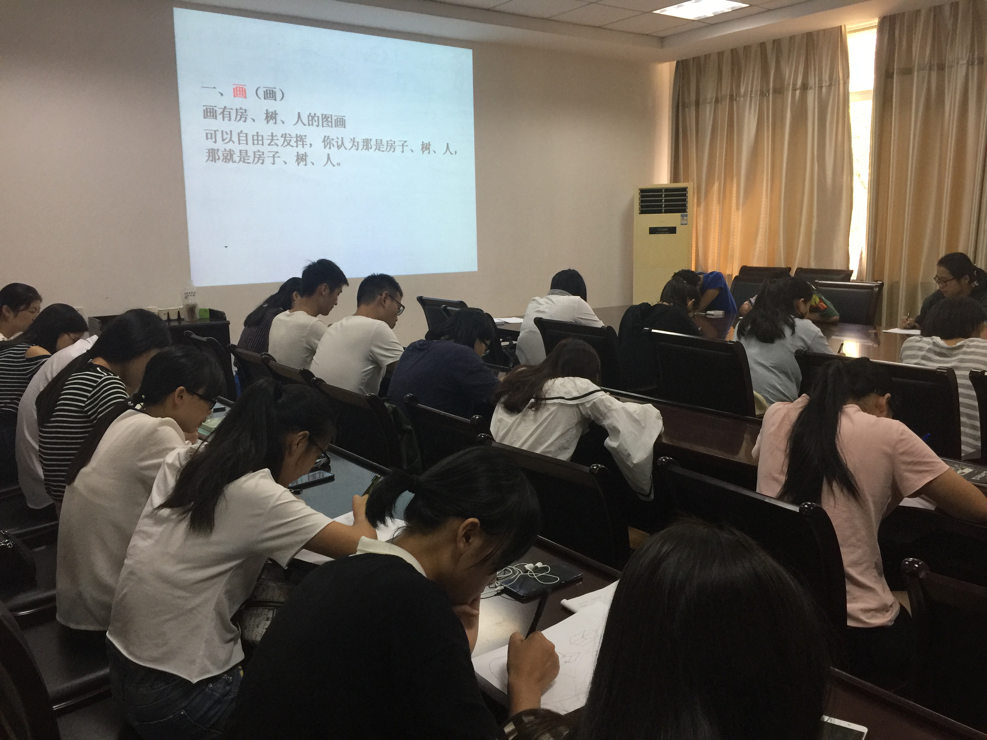 本次系列培训分为两个阶段,分别于9月13日、27日开展。第一阶段,林斗秀通过邀请参训师生“绘画‘房、树、人’,感悟自己的作品,用故事去介绍自己的绘画,相互倾听他人的故事,感受彼此的作品,最后解析绘画的含义”,使大家对绘画心理分析有了初步的认识。第二阶段,林斗秀将绘画、意象以及叙事等心理技术进行结合,开展团体绘画体验活动。通过互动活动,教师和学生们对绘画心理分析有了进一步的了解和学习。
