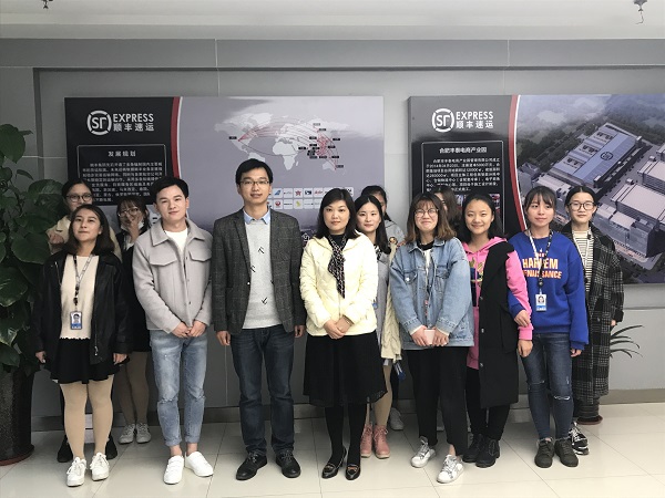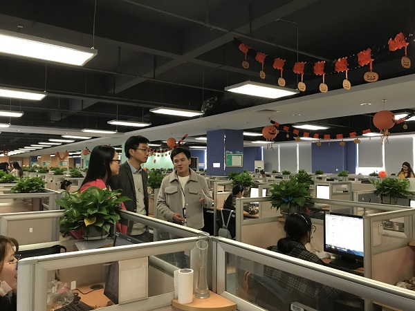 安徽顺丰通讯服务有限公司客服管理部高级经理郭涛接待了周景一行,并陪同参观了毕业生的工作环境,了解了其实习工作内容。