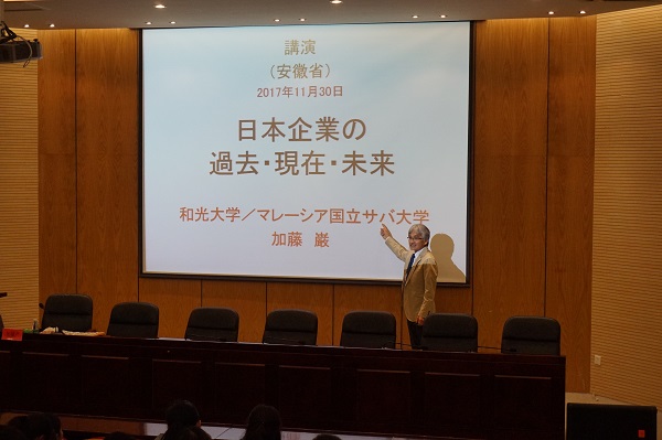 本网讯(通讯员:马兰、赵明)11月30日下午, 日本和光大学经济学院加藤巖教授应邀在bat365学术报告厅作题为“日本企业的过去、现在、未来”的讲座。此次讲座是“亚洲共同体”系列学术讲座第十一讲。讲座由外国语学院日语系主任宋志强主持,外国语学院日语系全体师生共计一百余人聆听。