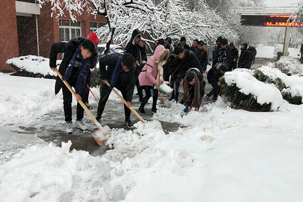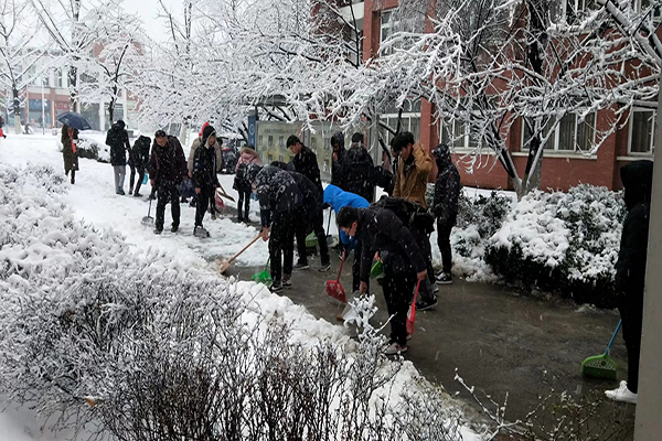 上午8时“清雪应急小组”开始行动,成员们带上铁铲、木铲等除雪工具开始在寒风中作业,将路面积雪清扫到道路两侧。寒风凛冽,学生们清雪的热情毫不减退,清雪工作有序进行。历时一上午,进行了两轮清扫,保证了教学楼与实验楼附近主干道路正常通行,给师生出行带来了便利。