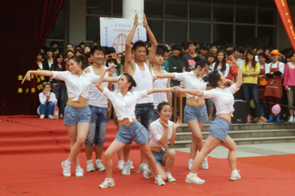 在啦啦队不断地呐喊助威声中,来自商学院、土木与环境工程学院、电子通信工程学院、外国语学院、动漫学院、信息工程学院及药学院代表队的队员们矫健的舞姿伴随着激情有力的的乐曲开始尽情表演。队员们灵动的步伐,精湛的技艺,默契的配合,以及新颖的方阵、队形的变换博得在场观众的声声呐喊和掌声。