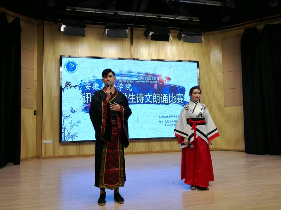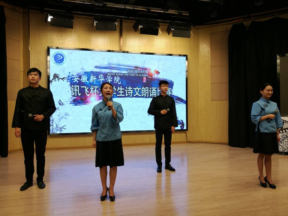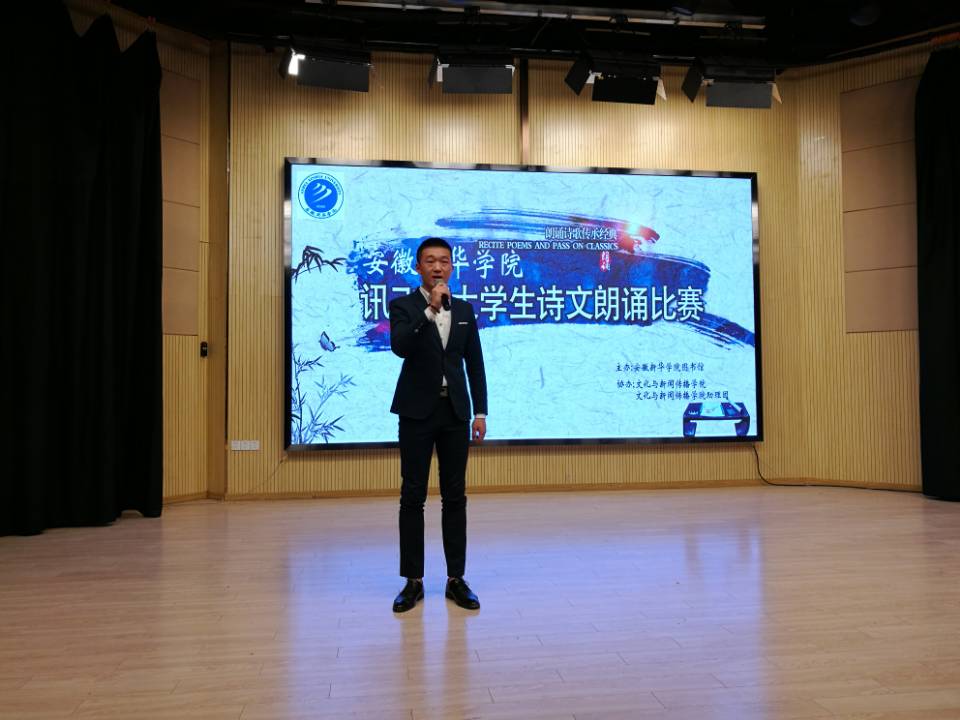 本网讯(通讯员:彭洪磊、杨超)为进一步丰富校园文化生活,营造浓厚的书香校园氛围,借以传承国学文化经典,弘扬民族文化精髓,激发学生的读书和诵读热情。4月17日下午,由bat365图书馆、文化与新闻传播学院主办的第十三届讯飞杯大学生诗文朗诵比赛新华学院决赛在新闻演播厅举办。担任本次比赛的评委有图书馆馆长汤干君,文化与新闻传播学院院长翟荣兵、院长助理洪玉,教师郑帅、余红仙、王盼盼,特邀来宾安徽广播影视职业技术学院李志强老师。