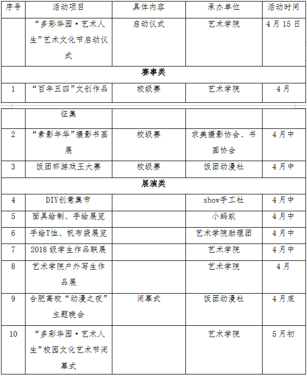 (四)各二级学院积极鼓励并动员学生参与“多彩华园·艺术人生” 文化节系列活动,立足文明校园建设,引导学生向上生活,跃动青春。各社团结合主题开展活动,活动具体安排见附件;活动结束将于闭幕式进行相关获奖表彰。