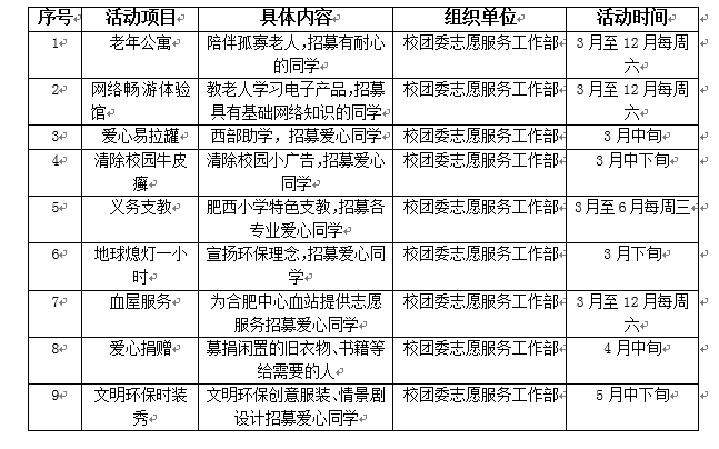 (三)鼓励并动员学生参与志愿公益系列活动,通过传递正能量培养学生高尚的情操和文明道德修养。校团委现面向全校招募志愿者,具体活动如下: