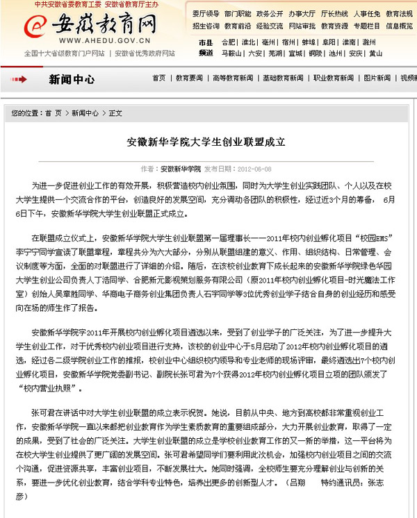 安徽教育网:bat365在线中国官网登录入口大学生成立创业联盟
