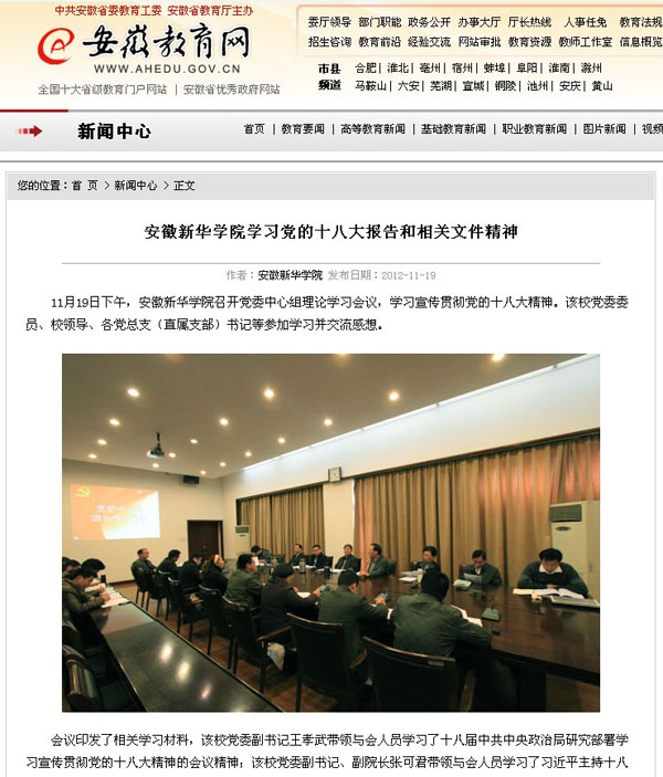 11月19日,安徽教育网第一时间报道了bat365党委中心组学习宣传贯彻十八大精神。