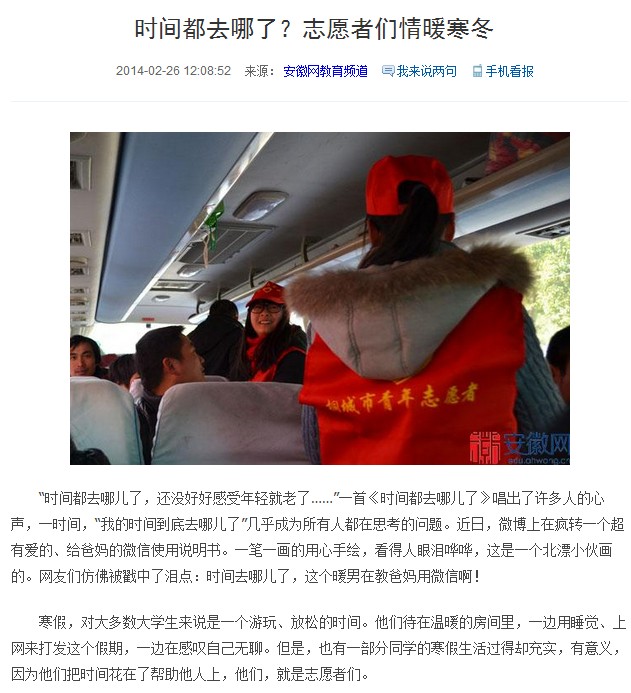 安徽网:时间都去哪了?志愿者们情暖寒冬