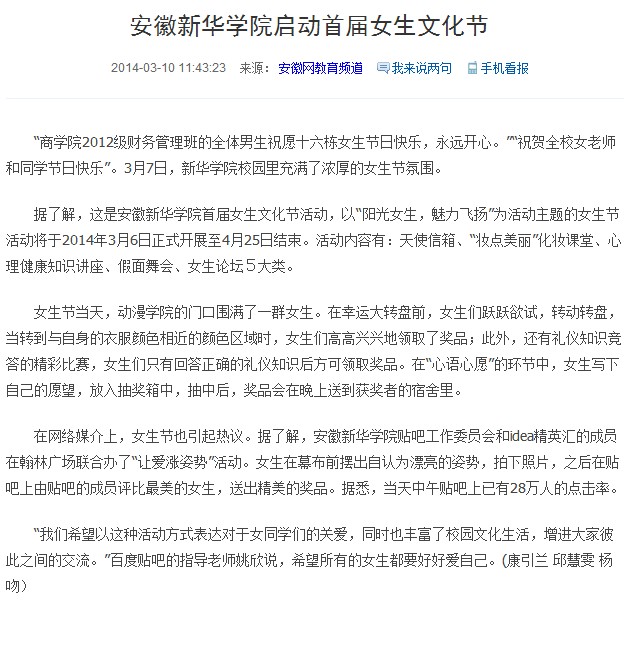 安徽网:bat365在线中国官网登录入口启动首届女生文化节