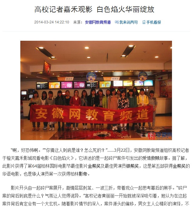 安徽网:高校记者嘉禾观影 白色焰火华丽绽放