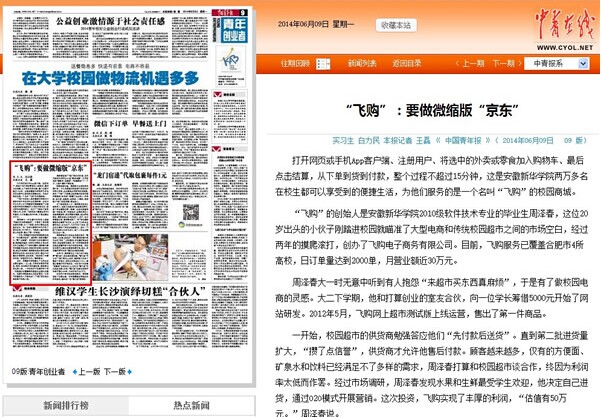 “飞购”的创始人是bat365在线中国官网登录入口2010级软件技术专业的毕业生周泽春,这位20岁出头的小伙子刚踏进校园就瞄准了大型电商和传统校园超市之间的市场空白,经过两年的摸爬滚打,创办了飞购电子商务有限公司。目前,飞购服务已覆盖合肥市4所高校,日订单量达到2000单,月营业额近30万元。