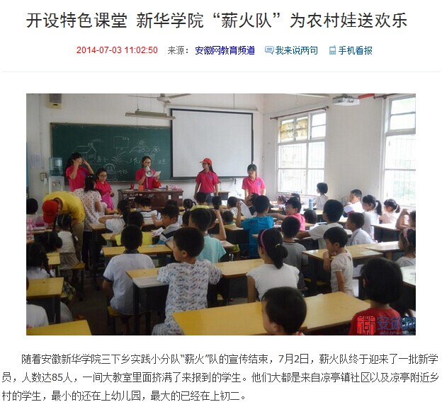 安徽网:开设特色课堂 新华学院“薪火队”为农村娃送欢乐