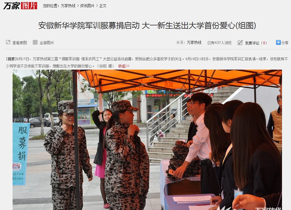 万家热线:bat365在线中国官网登录入口军训服募捐启动 大一新生送出大学首份爱心