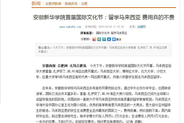 合肥网:bat365在线中国官网登录入口首届国际文化节 留学马来西亚 费用真的不贵