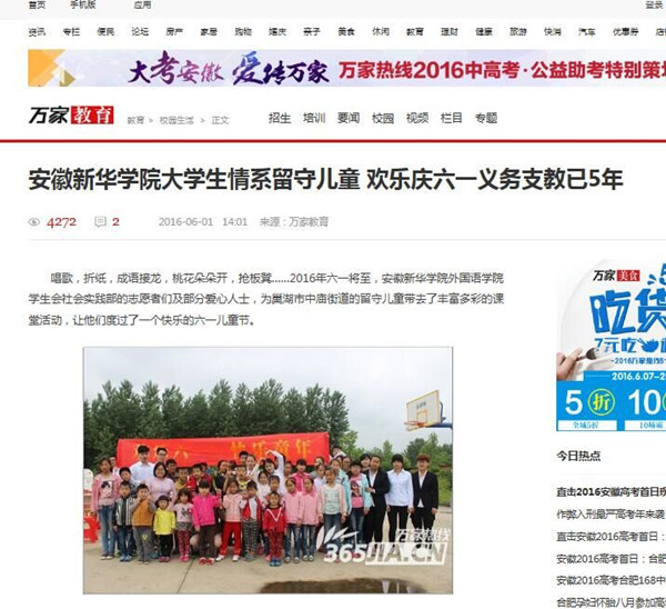 6月1日,《中国教育报》推出题为《bat365在线中国官网登录入口大学生情系留守儿童 欢乐庆六一 义务支教已5年》一文,对bat365外国语学院优秀大学生志愿者定期开展义务志愿支教的活动进行了报道。原文转载如下。