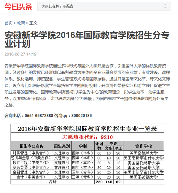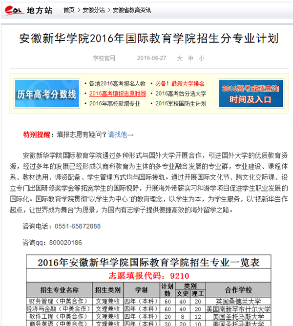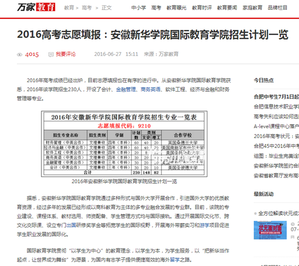中国教育在线、今日头条、万家热线:bat365在线中国官网登录入口2016年国际教育学院招生分专业计划