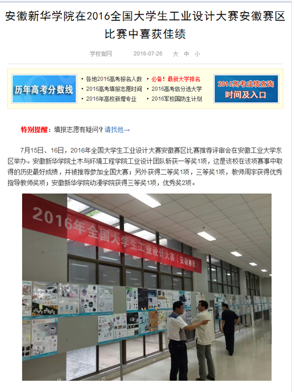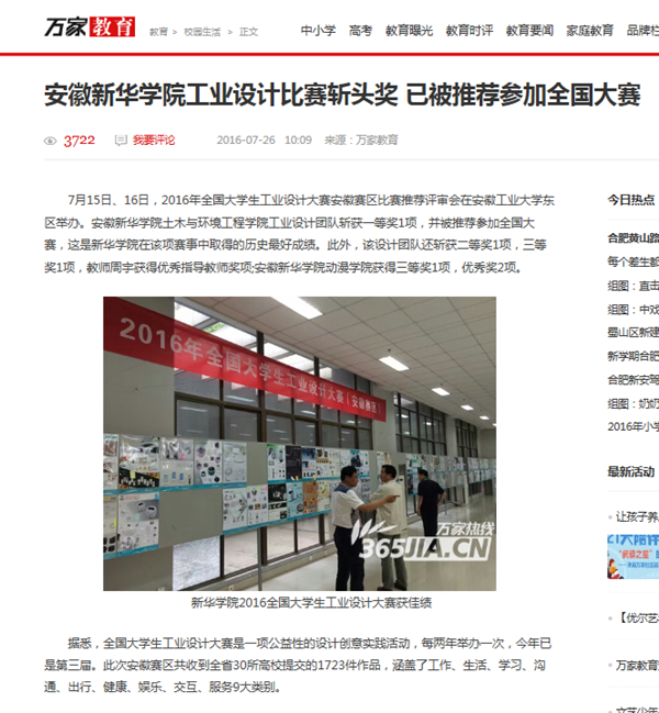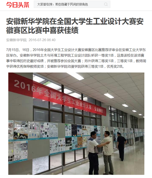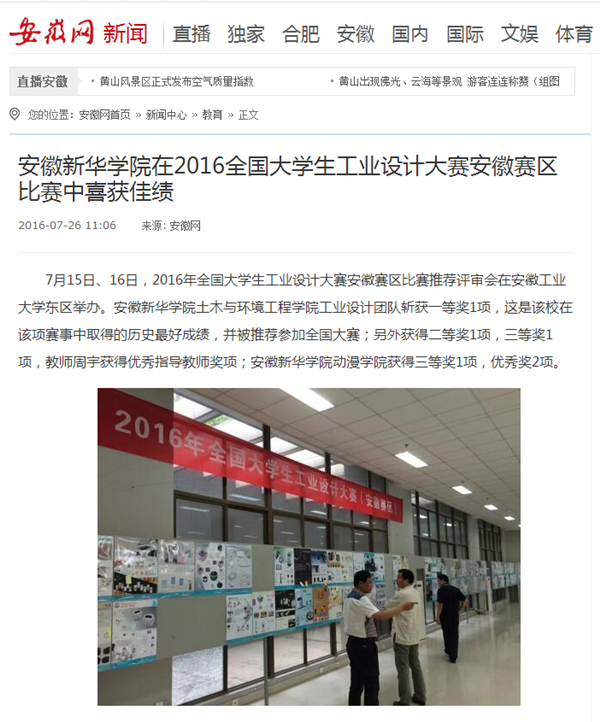 中国教育在线、今日头条、安徽网、万家热线、UC头条、新安晚报微博:bat365在线中国官网登录入口在2016全国大学生工业设计大赛安徽赛区比赛中喜获佳绩