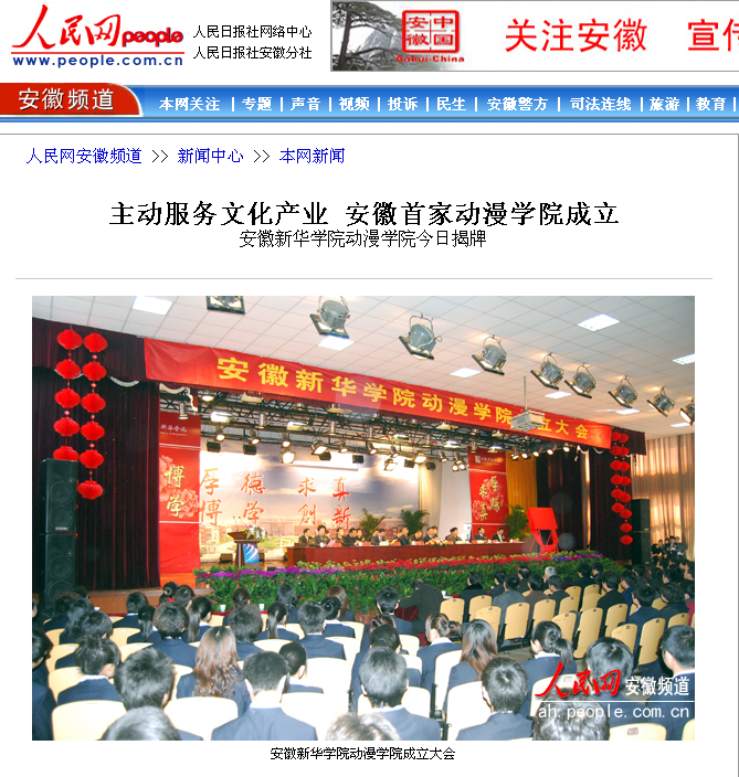 《人民网》:主动服务文化产业 安徽首家动漫学院成立——bat365在线中国官网登录入口动漫学院今日揭牌