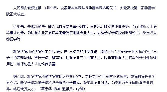 2010年4月16日,人民网/安徽频道/新闻中心/本网新闻对我院动漫学院揭牌一事进行了报道。相关链接:http://ah.people.com.cn/GB/channel2/15/201004/16/193138.html