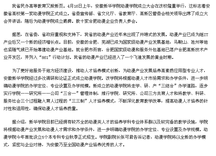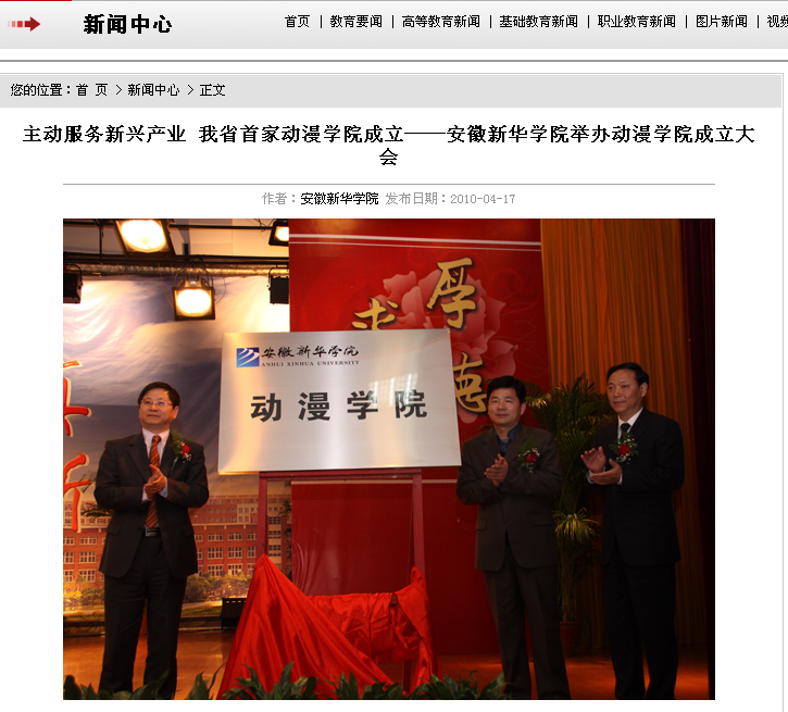 2010年4月17日,安徽教育网在首页高等教育新闻栏目中,对我院动漫学院成立一事进行了相关报道。相关链接:http://www.ahedu.gov.cn/newscentre/show.jsp?id=MTk0NTQ5