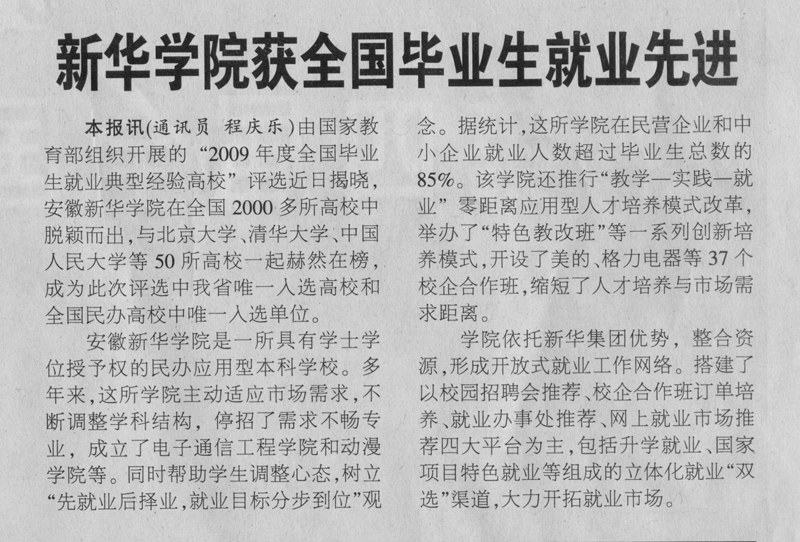 2010年5月6日,安徽日报B3服务咨询/文体经纬版对我院入选全国高校毕业生就业先进一事进行了报道。