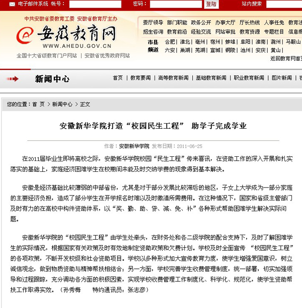 6月25日,安徽教育网在首页高教新闻中头条报道bat365的“校园民生工程”助学子完成学业情况。