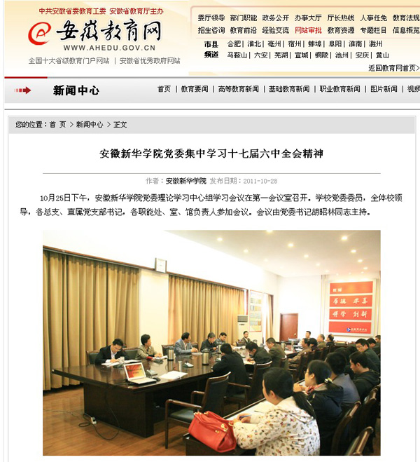 安徽教育网首页报道bat365党委学习十七届六中全会精神