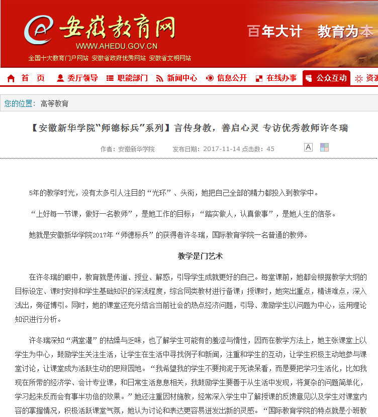 安徽教育网:【bat365在线中国官网登录入口“师德标兵”系列】言传身教,善启心灵 专访优秀教师许冬