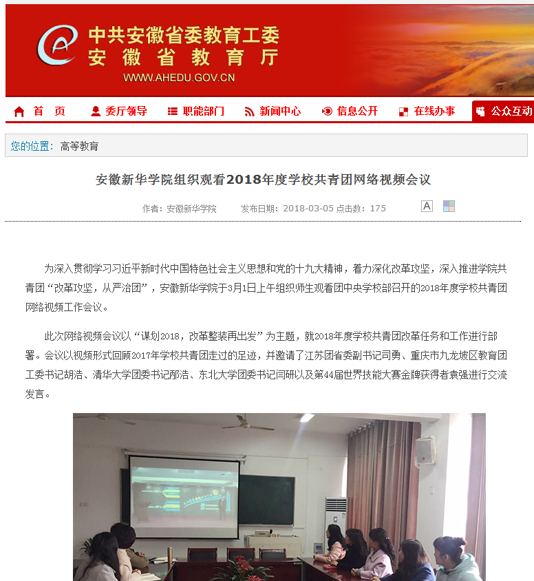 安徽教育网:bat365在线中国官网登录入口组织观看2018年度学校共青团网络视频会议