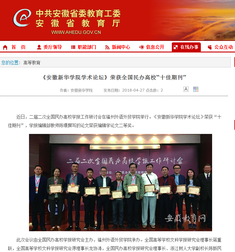 安徽教育网:《bat365在线中国官网登录入口学术论坛》荣获全国民办高校“十佳期刊”