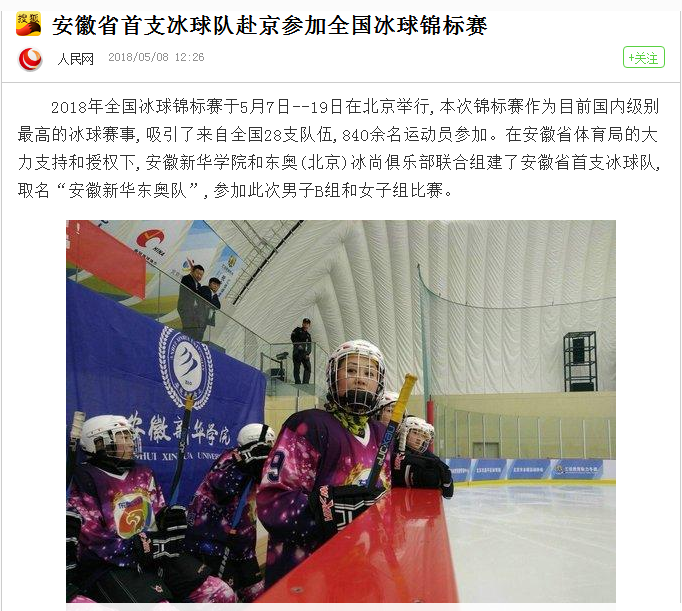 人民网、东方体育新闻、强国论坛、今日头条、搜狐网、新浪看点:安徽省首支冰球队赴京参加全国冰球锦标赛