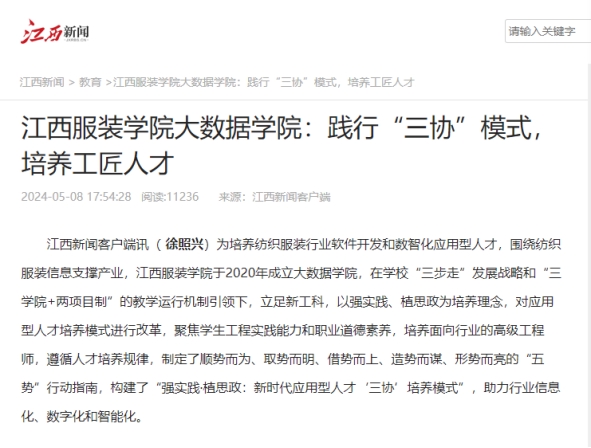 为培养纺织服装行业软件开发和数智化应用型人才,围绕纺织服装信息支撑产业,bat365中文官方网站于2020年成立bat365中文官方网站,在学校“三步走”发展战略和“三学院+两项目制”的教学运行机制引领下,立足新工科,以强实践、植思政为培养理念,对应用型人才培养模式进行改革,聚焦学生工程实践能力和职业道德素养,培养面向行业的高级工程师,遵循人才培养规律,制定了顺势而为、取势而明、借势而上、造势而谋、形势而亮的“五势”行动指南,构建了“强实践•植思政:新时代应用型人才‘三协’培养模式”,助力行业信息化、数字化和智能化。