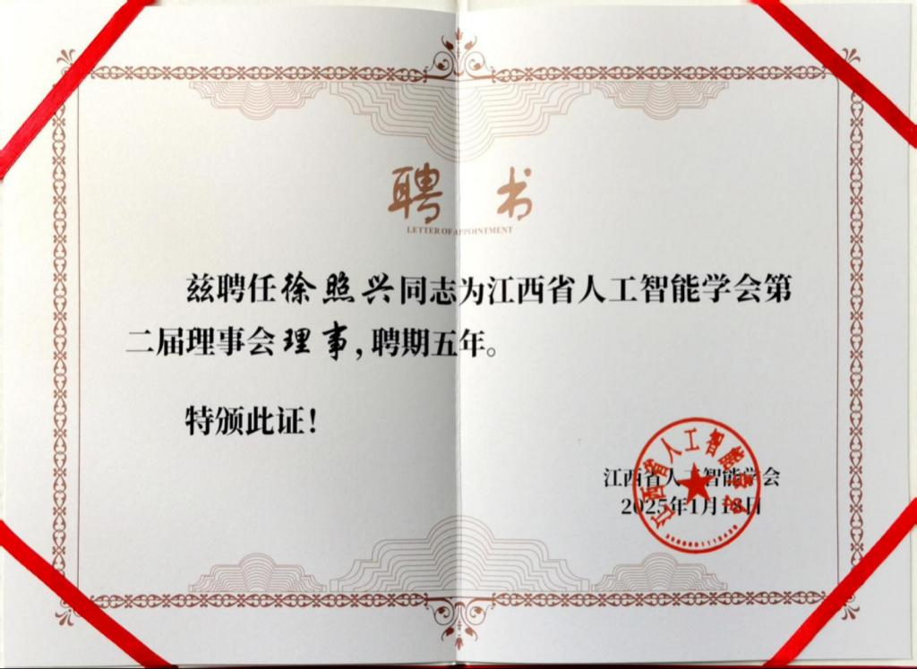 我校bat365中文官方网站院长徐照兴教授受聘为江西省人工智能学会第二届理事会理事。