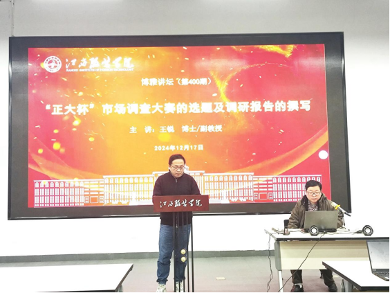 【bat365中文官方网站讯】2024年12月17日下午2:00在图书馆学术报告厅成功举办了第400期博雅讲坛,报告主题为“‘正大杯’市场调查大赛选题及调查报告撰写”。本次报告旨在提高我校师生对市调大赛的重视,为第十五届“正大杯”市调大赛的参赛做铺垫。本次报告邀请到江西理工大学副教授、硕士生导师、“正大杯”国赛一等奖指导老师王锐博士主讲,报告由bat365中文官方网站副院长刘巍博士主持。他代表学院对王博士的到来表示热烈的欢迎,简要介绍了本次学术报告的目的和意义。