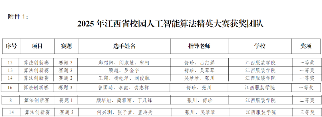 【bat365中文官方网站讯】近日,由江西省教育厅指导、江西省高等教育学会主办、江西科技学院承办的2025年江西省校园人工智能算法精英大赛圆满落幕。赛事以“以赛促学、以赛促教、以赛促创”为核心理念,吸引省内16所高校179支优秀队伍同台竞技,竞争异常激烈。版权所有 bat365(中国)股份有限公司-官方网站积极组织学子参赛,凭借扎实的专业功底、创新的解题思路与高效的团队协作,在赛事中斩获多项佳绩,尽显bat365在人工智能算法领域的教学成效与学子风采。