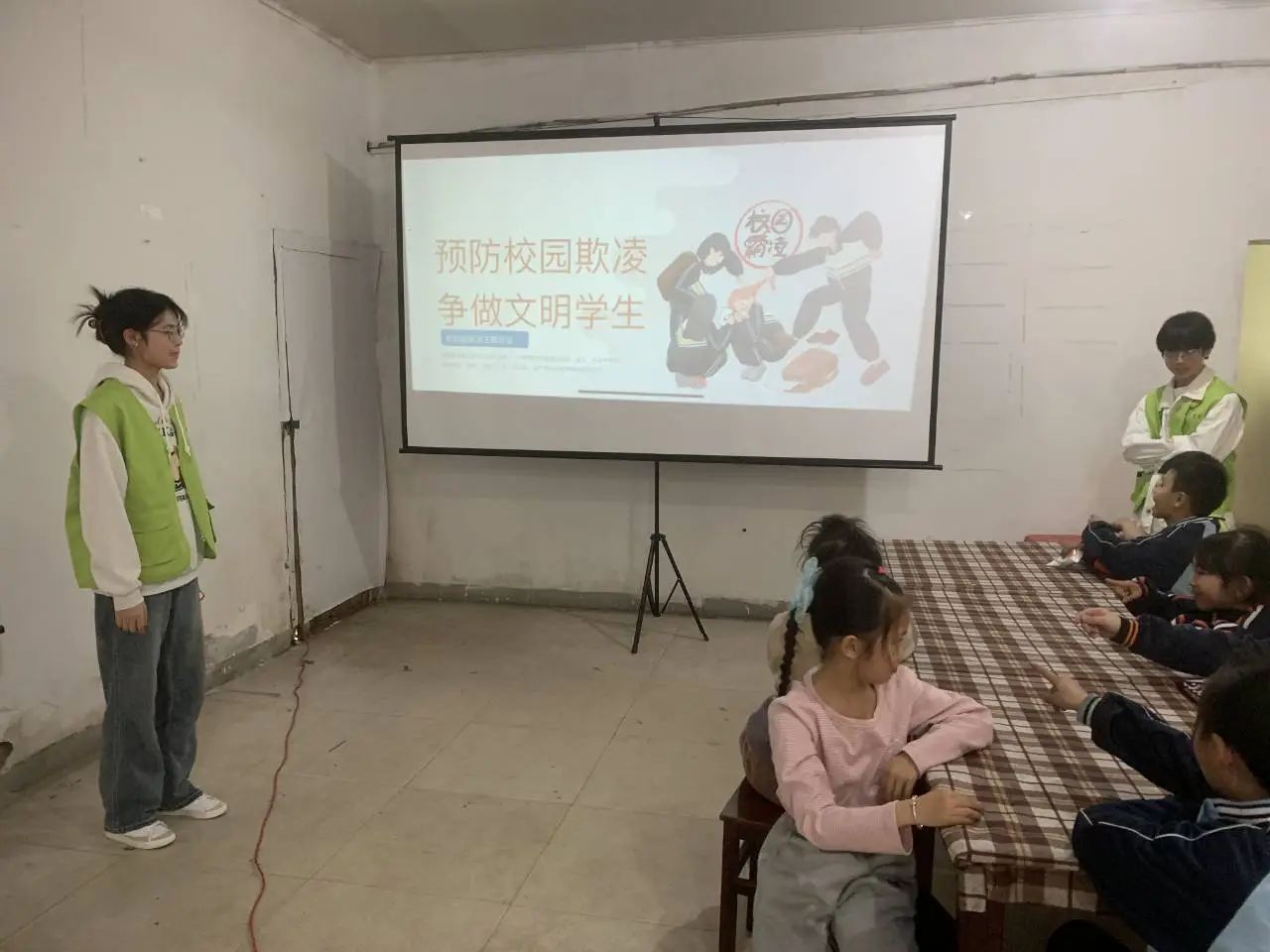 志愿者们提前半小时在党员活动室集合将工具和服装整理好后,统一前往活动地址。在活动过程中志愿者们热情地带领孩子们进行手工活动,彩绘艺术(画画),DIY折纸以及室外活动,123木头人等,积极调动了孩子们的热情。在此期间,志愿者们还利用PPT演讲的形式向孩子进行预防校园欺凌的宣讲,在宣讲过程中与孩子们积极互动,使这次宣讲圆满结束。最后,志愿者们在横幅上签名并与孩子们一起拍照留下这美好的瞬间。