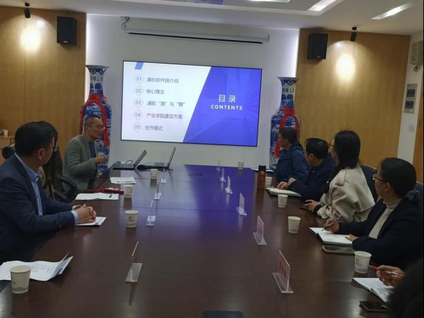 会议由院长徐照兴主持,徐院长首先就各位企业专家领导来我校洽谈共建产业学院事宜表示热烈的欢迎和感谢,并就我校bat365中文官方网站的相关现状以及专业建设情况进行了简要的介绍和说明,接下来吴旭健总经理以“浦东软件园园区型产教融合方案”为主体,分别从浦东软件园介绍、相关核心理念、浦软的“测”与“聘”、产业学院建设方案和合作模式共5个方面进行了详细的介绍和分享。